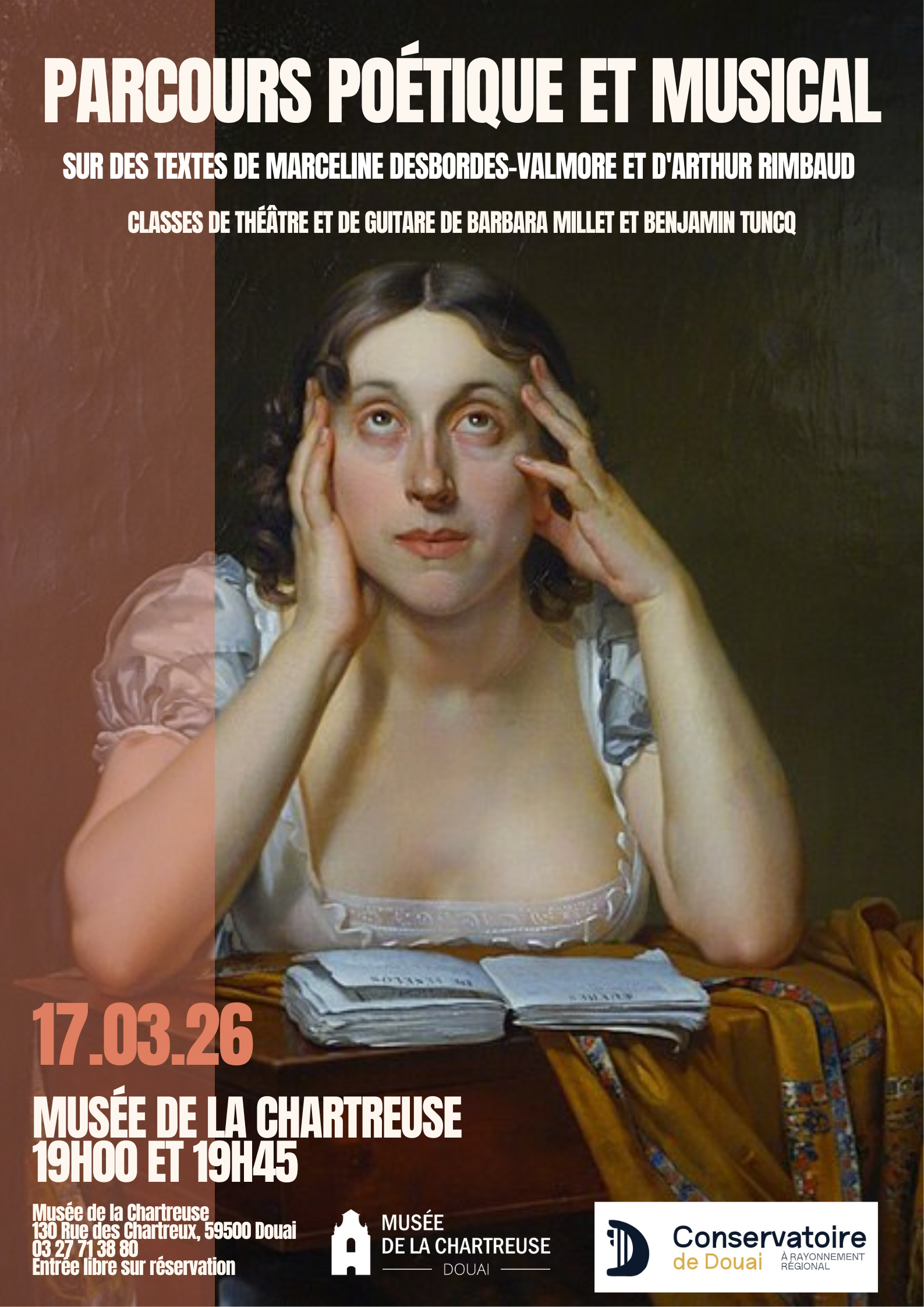 "Parcours poétique et musical" autour des poèmes de Marceline Desbordes-Valmore et des Cahiers de Douai d'Arthur Rimbaud avec les élèves des classes de guitare et d'art dramatique de Benjamin Tuncq et Barbara Millet.